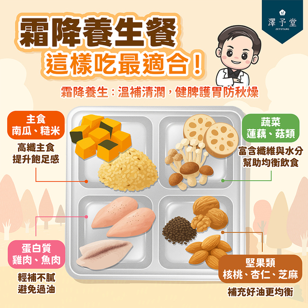 霜降時節正式登場,氣溫逐漸轉涼,是一年中養生進補的好時機。中醫講究「秋冬養藏」,強調飲食應以溫潤平和為主,既能調理脾胃、滋陰潤燥,又能為寒冬提前打好健康底子。適當的飲食調養,不僅能提升抵抗力,也能維持體重與活力,讓你在寒冷季節仍然精神滿滿。💪