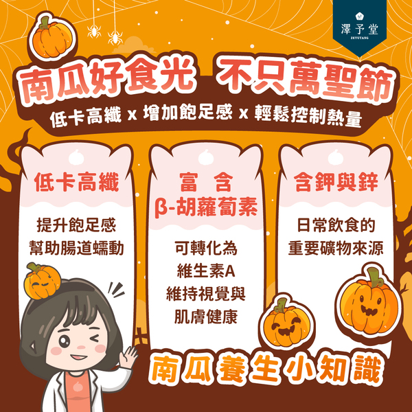 萬聖節的南瓜不只是節慶裝飾,它更是秋冬季節最實在的養生好夥伴。從南瓜湯到烤南瓜條,每一道料理都能兼顧美味與營養。這個秋天,試著讓餐桌多一點橘色能量,讓南瓜不只點亮節日氛圍,也點亮你的好氣色與好體力。