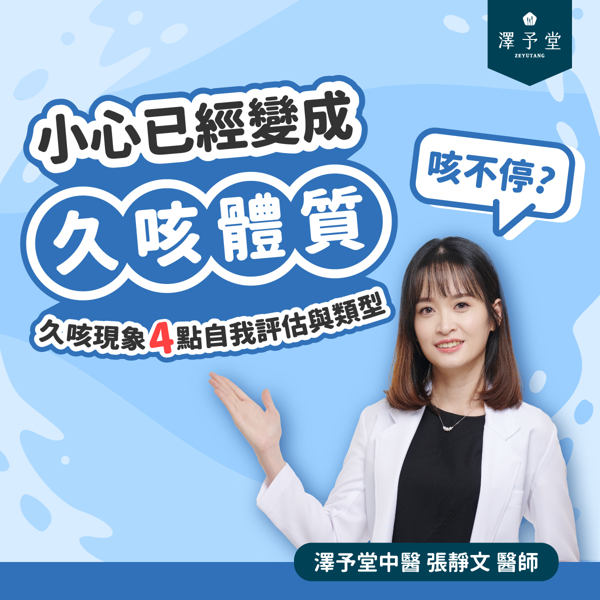 久咳不僅嚴重影響生活品質,導致夜不成眠、精神不濟,它更可能是身體發出的重要警訊,提醒您:是時候進行根本性的調理了!澤予堂中醫張靜文醫師提醒,久咳不可輕忽,越早找出原因並對症治療,越能避免反覆發作,加速痊癒。