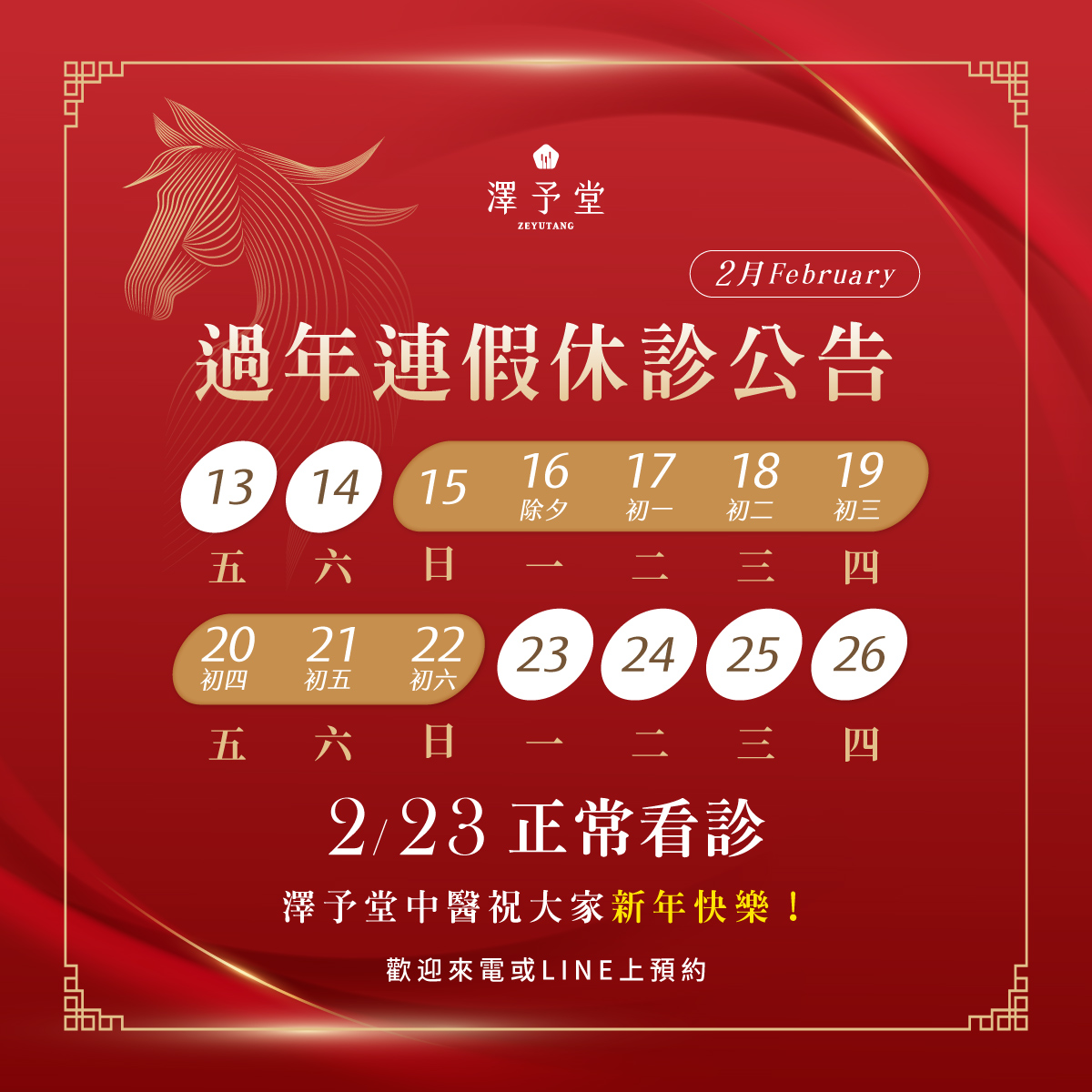 #澤予堂中醫 #成祐中醫 #元熙中醫 #竹北中醫 #公益分院 #中科分院 #竹北分院 #大里分院 #春節 #休診公告