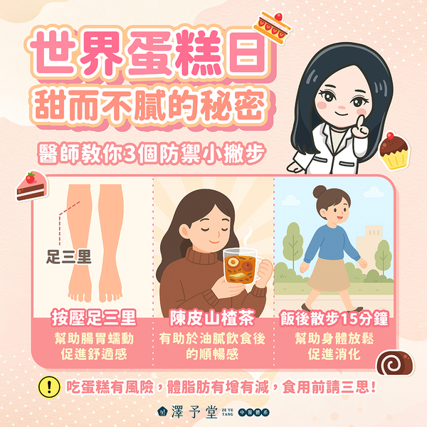 以「世界蛋糕日」為主題,中醫提供三個簡單、日常就能做到的小撇步,只要在吃甜後多做這些貼心調整,就能讓身體更輕鬆、更不容易累積負擔,安心享受甜味帶來的幸福感。