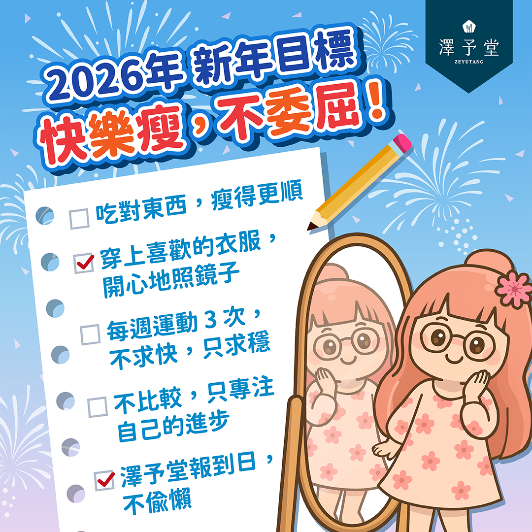 現在就預約 澤予堂,讓專業中醫師為你量身打造專屬的瘦身計畫,2026 年,我們陪你一起「瘦」得漂亮、瘦得健康!