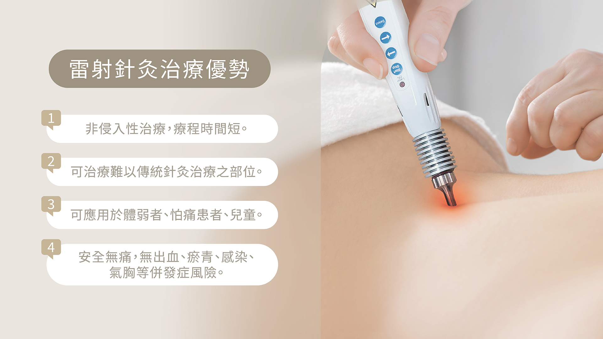 A:相比傳統針灸需要留針,雷射針灸採用光療的方式,無侵入性且更安全、省時,相當適合用於兒童、身體虛弱及怕痛容易暈針的患者。